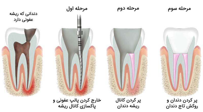 • دندان ضدعفونی و با مواد مخصوص (گوتاپرکا) پر شده و پانسمان موقت قرار می‌گیرد.
