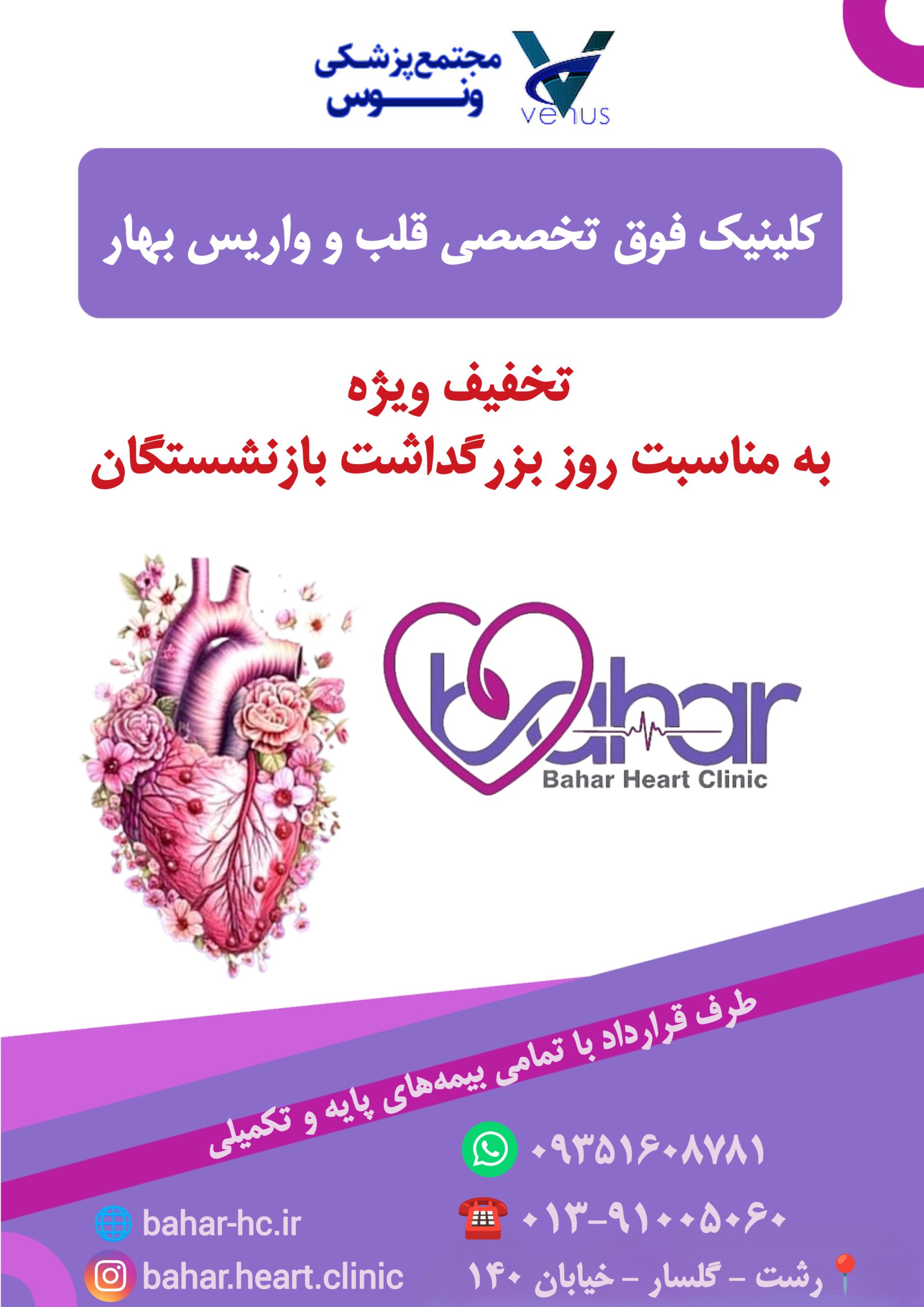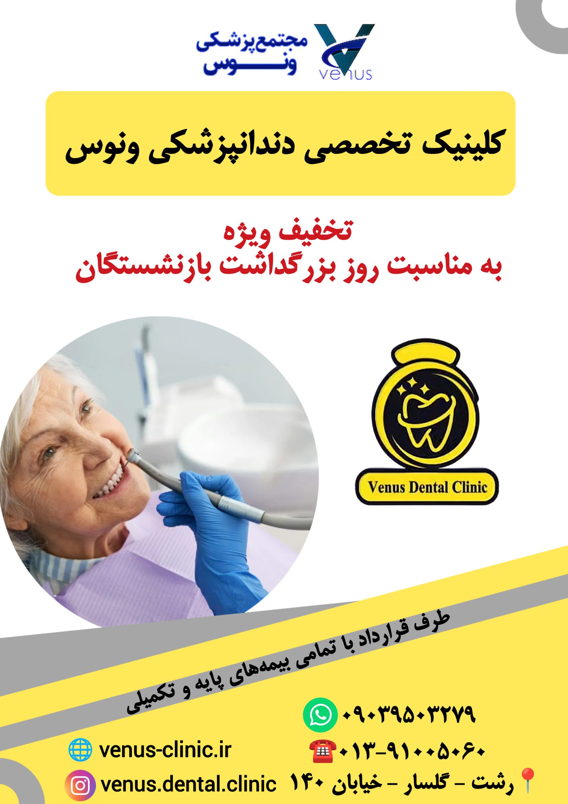 مجتمع پزشکی ونوس با افتخار به مناسبت بزرگداشت روز بازنشستگان، تخفیفهایی را برای خدمات دندانپزشکی و قلبی ارائه میدهد. این تخفیفها به پاس قدردانی از زحمات و خدمات ارزشمند بازنشستگان عزیز در نظر گرفته شده است.